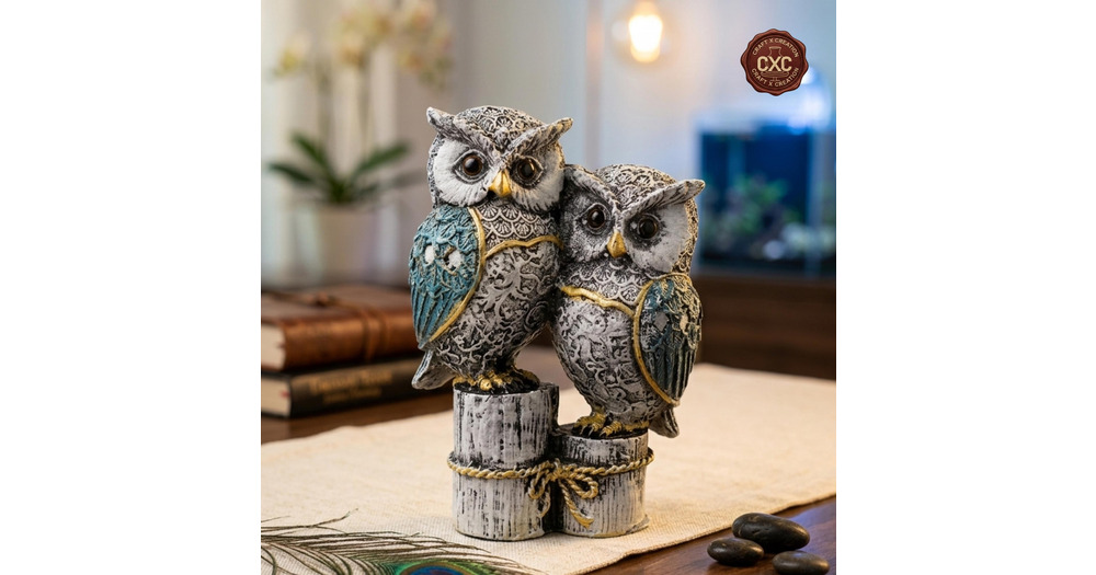 Cute Resin Joint Owl Sculpture | Vintage Owl Figurine | Blue Owl Tabletop Decor | Owl Family Statue