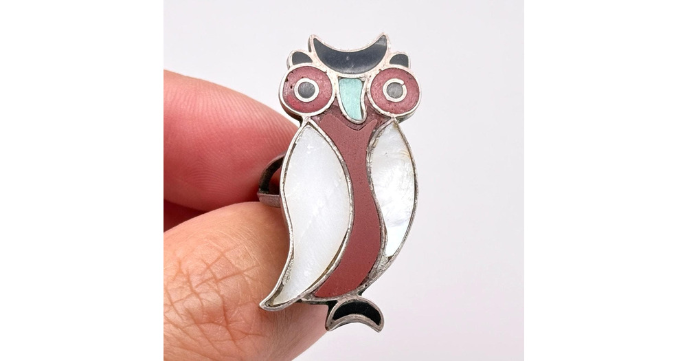 Vintage Southwestern Owl Bird Multi Stone Inlay Silver Ring Size 7