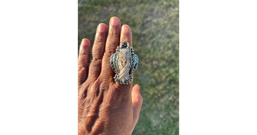 Owl Adjustable Ring, Buffalo Bone Silver Overlay | Handmade Wisdom Totem Jewelry | Spiritual Animal