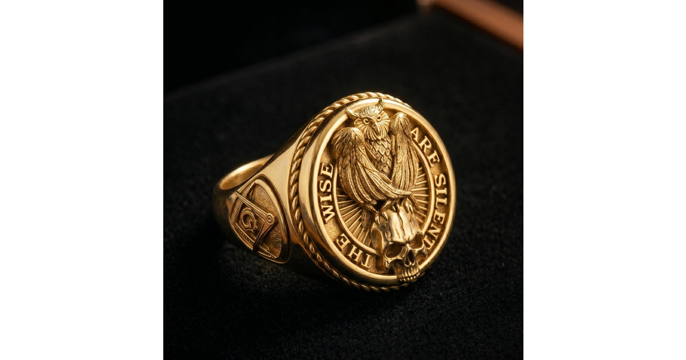 Sterling Silver Owl Skull Ring, Gothic Masonic Signet, 14K Gold Plated Gift