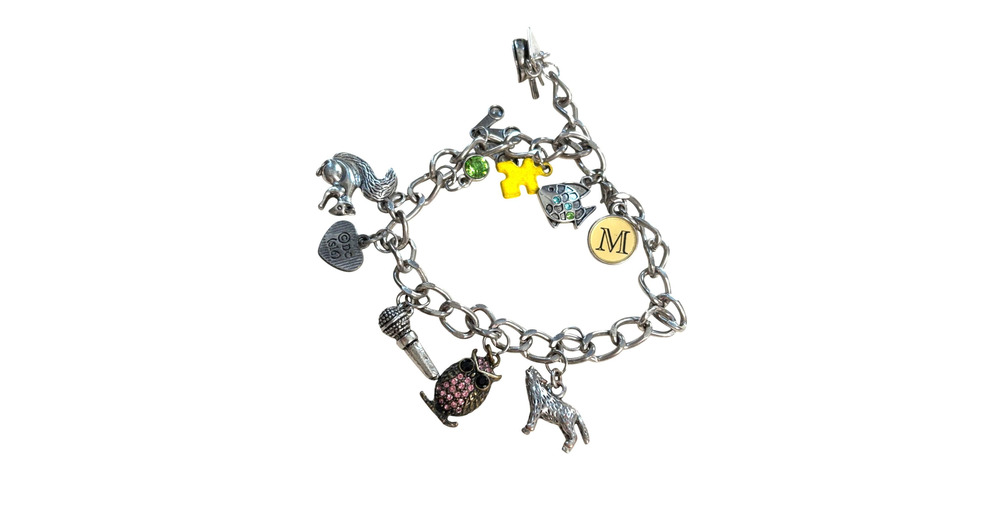 Silver Charm Bracelet W/ Owl Squirrel Fish Heart & Letter M Charms BATMAN