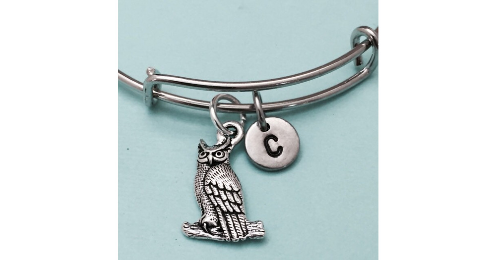 Owl bangle, owl charm bracelet, expandable bangle, charm bangle, personalized bracelet, initial brac