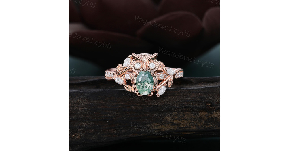 Owl Engagement ring Vintage Rose gold Art Deco Twig Vine Oval Moss Agate Wedding Ring Unique Antique